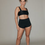 This textured Black Rib fabric has a more generouse stretch than our solid colours. If you’re between sizes, we recommend sizing down in this style.