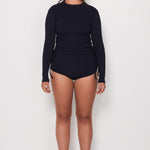 Invest in our Ruched Rashguard and experience the perfect blend of sun protection, style, and comfort for your active beach lifestyle.