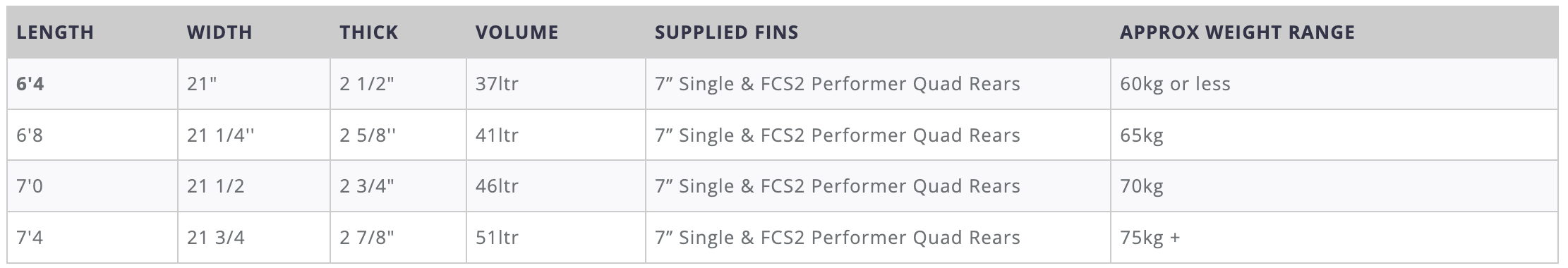 6'4 length | 21" width | 2 1/2" thick | 37L volume