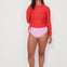 Woman wearing a red punchy bikini top and light blue high-waisted reversible drifter bottoms on a white background