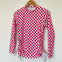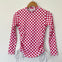 Person wearing a red and white checkered rashguard and pink high-waisted bikini bottoms on a white background